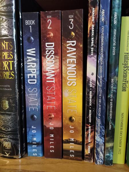 went off to have adventures. Mixin thinks the two of them deserve their share of adventures, too---and oh boy, they're going to get some. But while it's their story, there's lots of Jasper and Havoc, lots of Kay and Sunny, complicated sibling dynamics, tense and tender family moments, new AI friends and old enemies. One of my most joyful moments in this process was when I (finally!) got to set print copies of all three books next to each other on my bookshelf. I can't wait to share it with you.