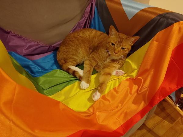 Happy Pride! We put up a flag for the first time this year, but of course the cats colonized it before we could attach it outside. Ada and Charlie, queen and king of Pride?